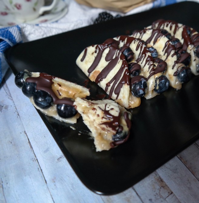 4 – cospargete del burro di arachidi sopra al ripieno di banana e applicatevi sopra dei mirtilli;