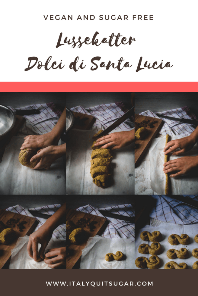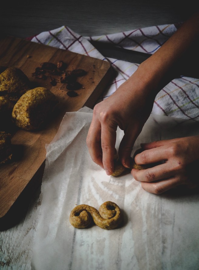 6 – formate le tipiche forme ad S dei Lussekatter e disponete un pezzo di fava alle estremità nel punto centrale della vostra piega;