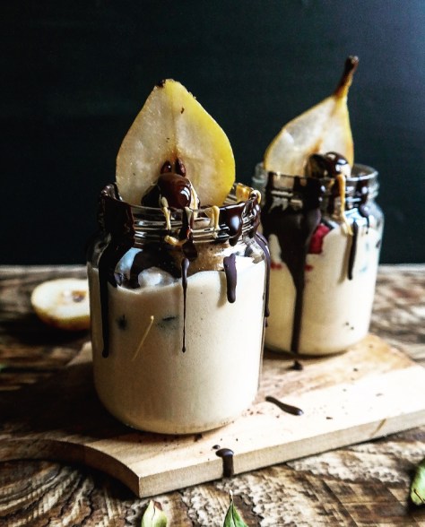 6 – trascorse le quattro ore possiamo servire la nostra mousse, decorando con yogurt, cioccolato fuso e le dough di avena formate precedentemente. Aggiungiamo delle fette di pera sopra per aggiungere dettagli alla composizione.