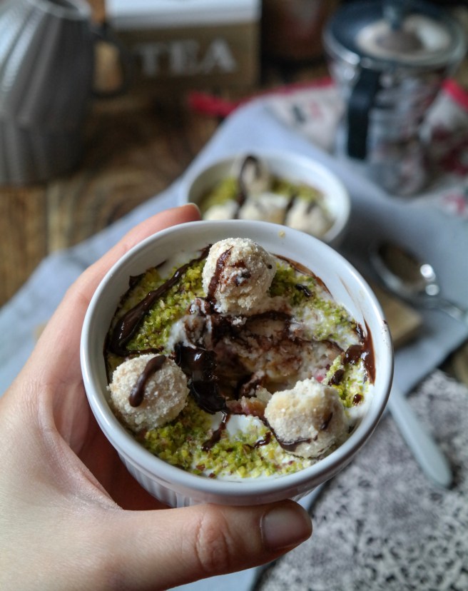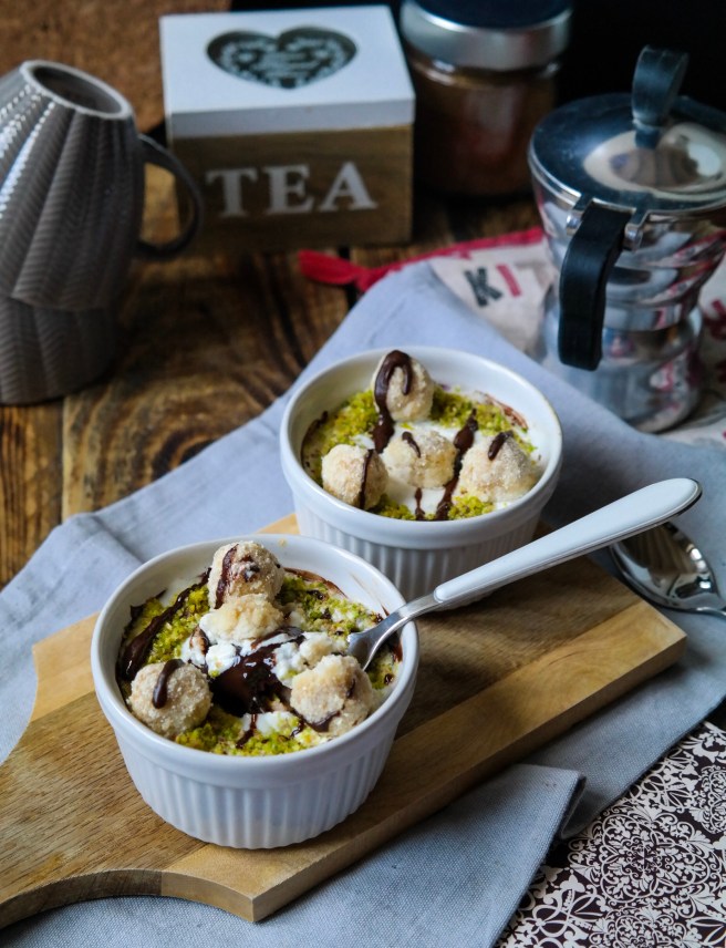 Potete utilizzare la base del tortino per decorarlo in mille modi possibili! La mia versione prevede l’utilizzo di farina di pistacchi e dei piccoli “bite” ottenuti con farina di cocco e crema di arachidi al naturale, che donano golosità e un tocco di classe alla torta in tazza.