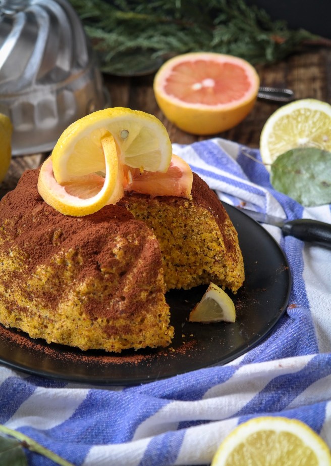 5 – lasciate raffreddare bene, poi estraete dallo stampo da bundt cake capovolgendo in un piatto. Spolverate con cacao amaro, decorate con qualche fetta di pompelmo e limone fresche e servite.