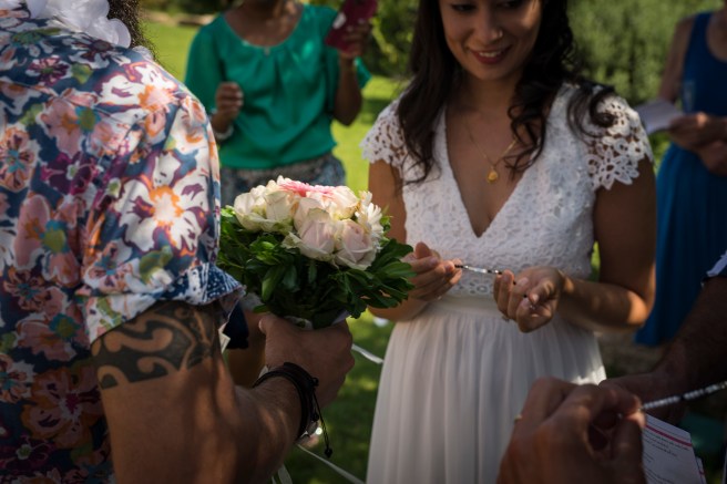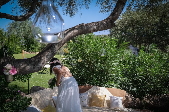 Abbiamo appositamente affitato una casa che avesse un giardino grande, in modo che la gente si “disperdesse” nello spazio a disposizione. Abbiamo individuato un angolo che fosse consono ad essere “addobbato” e allestito ad una sorta di “chiesa”, disponendo delle sedie e usando dei fiori e del tulle per creare l’atmosfera.
