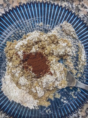 3 – a questo punto aggiungete l’avena ridotta in farina, il lievito in polvere e la cannella e mescolate bene;