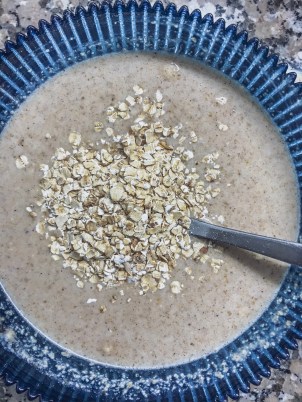 4 – a questo punto unite il latte, poi aggiungete la farina di cocco (se non avete usato 90 gr di avena) e i 15 gr di fiocchi d’avena mantenuti integri;