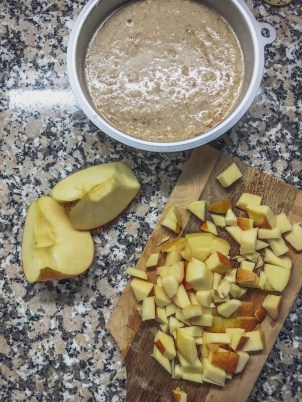 6 – dice or slice the apple and add it to the cake batter, then put the cake tin in the oven and bake in the preheated oven for 40 minutes. Let the cake cool completely before removing from the tin by turning it upside down on a plate. You can serve the cake still warm, or better at room temperature as it tends to crumble when still warm.