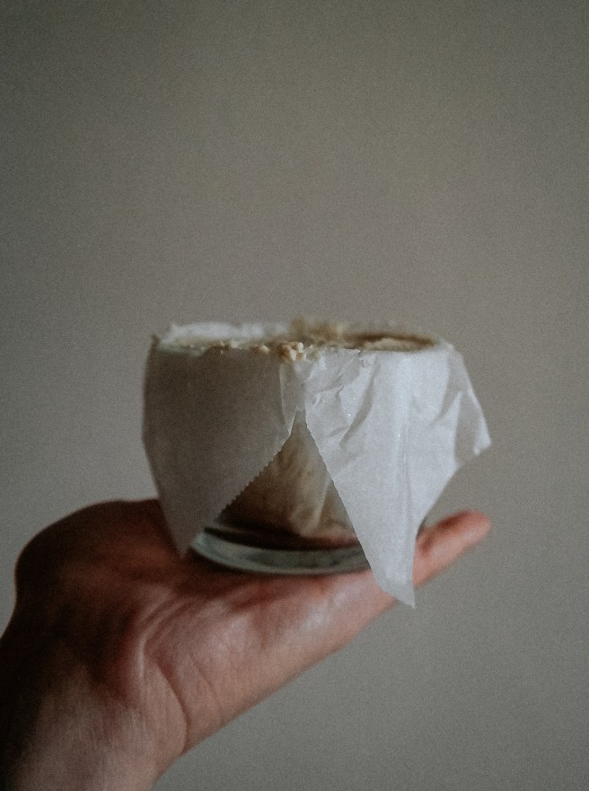 5 – prendete una coppetta di piccole dimensioni e rivestitela con della pellicola trasparente o con della carta da forno;