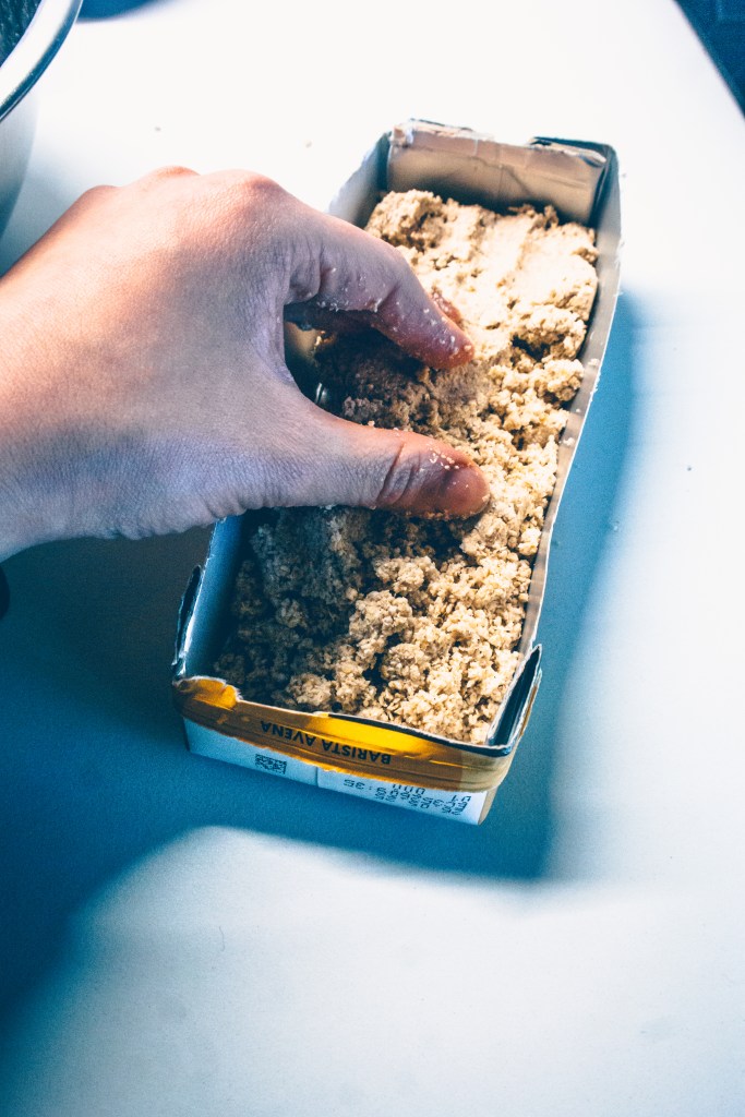 - Prepara la base: trita l’avena in un robot da cucina fino a ridurla in polvere. Versala in una ciotola e aggiungi l’olio di cocco precedentemente sciolto e il latte di soia. Lavora brevemente con le mani, poi trasferisci all’interno di uno stampino rettangolare. Io ho usato un cartone del latte lavato e tagliato a metà verticalmente. Versa all’interno del contenitore il composto, pressa con le dita e poi livella usando il dorso di un cucchiaio. Ora, versa sopra la base al caramello con gli arachidi, poi trasferisci tutto in freezer per almeno 4 ore, o per tutta la notte.