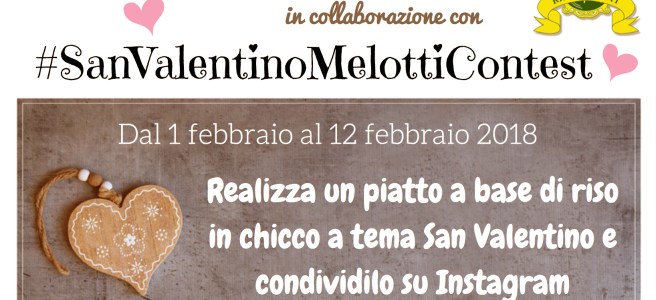 Il mese di febbraio è ormai vicino e tutti sappiamo che FEBBRAIO è sinonimo di.... San Valentino, la festa degli innamorati! Quanti di voi saranno ai fornelli per stupire l'amato o l'amata con una cena esclusiva? Da giovedì 1 febbraio fino al 12 febbraio 2018, io e Riso Melotti vi chiederemo di svelarci in anteprima … Leggi tutto Partecipa al CONTEST GIVEAWAY di SAN VALENTINO su Instagram in collaborazione con RISO MELOTTI